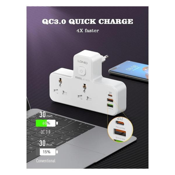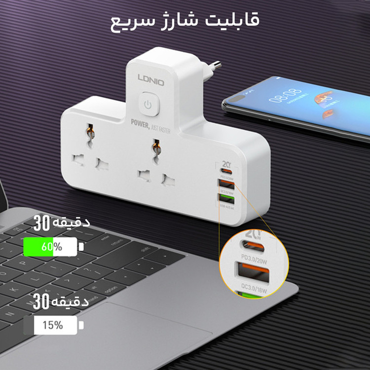 کمپانی الدینیو محصول چند کاره SC2311 را طراحی کرده که با پشتیبانی از قابلیت استفاده به عنوان چند راهی، شارژر و چراع خواب روانه بازار شده است. این دستگاه از بدنه ای به جنس پلی کربنات ساخته شده که استحکام کافی را در برابر ضربه، فشار و حرارت ارائه می دهد. دو عدد پریز بر روی بدنه تعبیه شده که ضمن نیاز به استفاده از مبدل با انواع دو شاخه ها سازگاری دارد و براساس ولتاژ ورودی 100 تا 250 ولت از اتصال دستگاه های مختلف الکتریکی پشتیبانی می کند. این پریزها همچنین مجهز به محافظ کودک نیز می باشند و کلید فیزیکی روشن و خاموش جهت قطع جریان برق نیز بر روی بدنه قرار دارد. یک لامپ LED برای این چندراهی برق در نظر گرفته شده که فقط با یک لمس فعال و با نور ملایم سفید رنگ خود به عنوان چراغ خواب و یا روشنایی در محیط های تاریک قابل استفاده خواهد بود. بر روی این دستگاه دو پورت USB و یک درگاه Type-C قرار دارد که برای اتصال و شارژ انواع گوشی موبایل، تبلت و … مناسب می باشند و امکان شارژ همزمان و ایمن چند دستگاه را ارائه می دهند. پورت USB 1 از فناوری شارژ سریع نسخه QC3.0 پشتیبانی می کند و با جریان عبوری متغیر 3 آمپر در ولتاژ 5 ولت، 2 آمپر در ولتاژ 9 ولت و 1٫5 آمپر در ولتاژ 12 ولت انواع گجت ها را با سرعتی مطلوب شارژ خواهد کرد. پورت دیگر USB از فناوری Auto-ID بهره برده و با حداکثر شدت جریان 2٫4 آمپر در ولتاژ 5 ولت عملیات شارژ رسانی را با سرعت و ایمنی مناسب انجام می دهد. شدت جریان خروجی پورت تایپ سی نیز به صورت متغیر برابر با 3 آمپر در 5 ولت، 2٫22 آمپر در 9 ولت و 1٫67 آمپر در 12 ولت می باشد که با توان خروجی 20 وات قادر به شارژ دستگاه های سازگار است. LDNIO SC2311 به فناوری Power Delivery و چیپست هوشمند مجهز شده که با تشخیص و متناسب سازی جریان و ولتاژ دستگاه متصل، از ایجاد آسیب باتری در برابر نوسانات ولتاژی، بار اضافی جریان و برق، اتصالات کوتاه و دمای بیش از حد جلوگیری خواهد کرد.