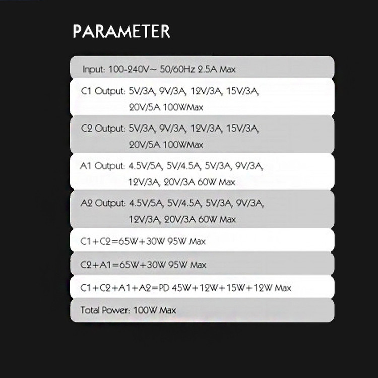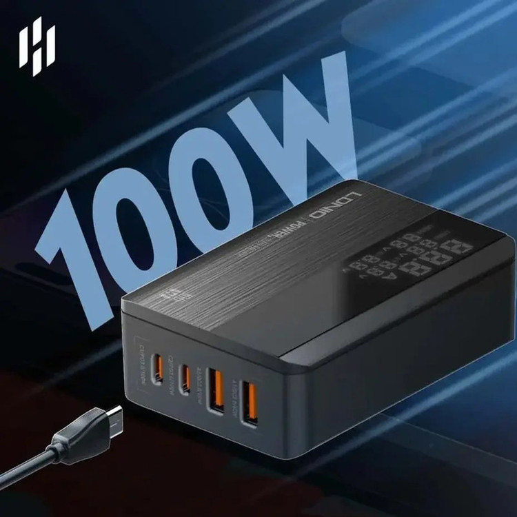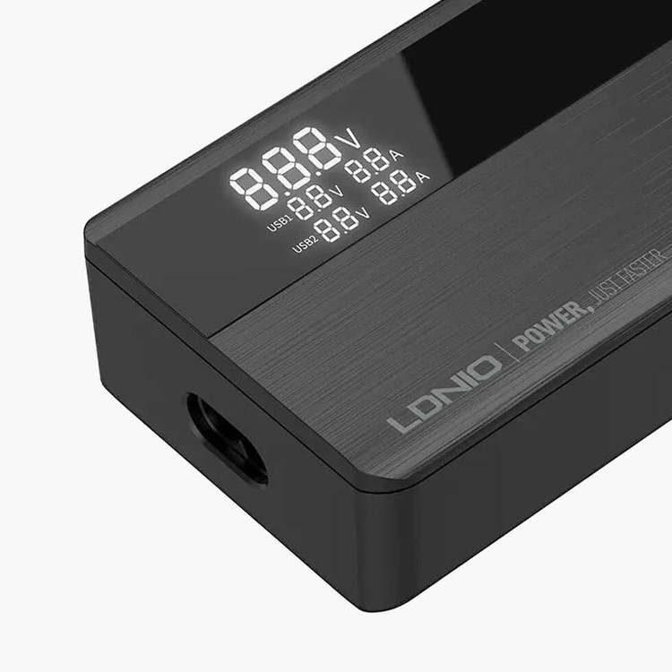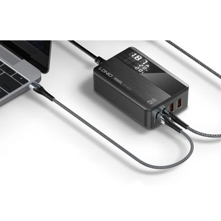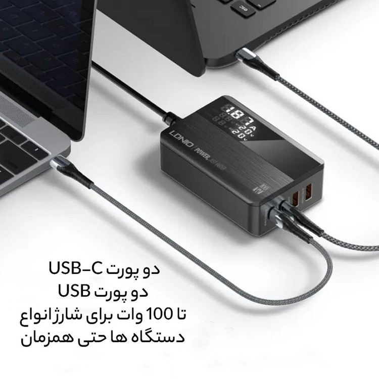 شارژر LDNIO A4809C با حداکثر توان خروجی 100 وات و داشتن 4 پورت خروجی متشکل از 2 عدد USB و 2 عدد Type C می تواند انتخاب خوبی برای میز کارتان باشد. این شارژر رومیزی با فناوری ساخت گالیم نیترات GaN طراحی شده است و از مواد PC نسوز تا 850 درجه سانتیگراد ساخته شده است و به عنوان هاب شارژر مورد استفاده قرار می گیرد. روی بدنه آن یک صفحه نمایش دیجیتالی قرار گرفته تا میزان ولتاژ و شدت جریان شارژ را به شما نمایش دهد. هاب شارژر الدینیو A4809C با پروتکل شارژ گوشی های آیفون، سامسونگ، هوآوی، شیائومی و ویوو سازگاری دارد و از پروتکل های فست شارژ QC4.0, PD3.0, SCP, VOOC, AFC, FCP و Auto ID پشتیبانی می کند. درگاه تایپ سی این محصول با توان 100 وات، مناسب شارژ لپ تاپ نیز است. شارژر LDNIO A4809C در برابر توان، ولتاژ، شارژ شدن و دمای اضافی مقاوم است. همچنین در برابر اتصال کوتاه و میدان مغناطیسی و ولتاژ پایین نیز ایمن است. این شارژر دارای 4 پورت خروجیست که شامل 2 عدد USB و 2 عدد تایپ سی میشود که یعنی شما می توانید همزمان 4 دستگاه خود را با آن شارژ کنید. در این شارژر، خروجی C1 و C2 از نوع تایپ سی است و هر کدام دارای جریان/ولتاژ خروجی 5V/3A-9V/3A-12V/3A-15V/3A-20V/5A و حداکثر توان 100 وات است. خروجی A1 و A2 از نوع USB است، و هر کدام دارای جریان/ولتاژ 4.5V/5A-5V/4.5A-5V/3A-9V/3A-12V/3A-20V/3A و حداکثر توان خروجی 60 وات است. در صورتی که خروجی های تایپ سی هاب شارژر الدینیو A4809C به صورت همزمان (C1+C2) مورد استفاده قرار بگیرد حداکثر توان روی هم 95 وات (65W+30W) و برای خروجی های (C2+A1)، 95 وات (65W+30W) می رسد. در صورتی که تمام 4 خروجی هاب شارژر الدینیو A4809C به صورت همزمان مورد استفاده قرار بگیرد توان هر خروجی به ترتیب (C1+C2+A1+A2) برابر (PD 45W+12W+15W+12W Max) می شود. در داخل پک این محصول، یک کابل 1.5 متری برق قرار دارد که از نوع دوشاخه EU است و با پریزهای ایرانی سازگار است و نیازی به خرید تبدیل جداگانه نخواهید داشت.