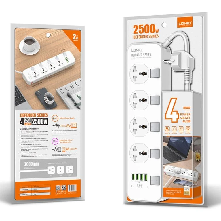 چندراهی برق الدینیو مدل SC4408 دارای 4 عدد پریز با کلید و پورت شارژر USB به تعداد 4 عدد خروجی برق است. یکی از مزایای استفاده از چندراهی برق الدینیو مدل SC4408، این است که بدون نیاز به هیچ گونه تبدیلی برای 2 شاخههای رایج در ایران قابل استفاده خواهد بود و 4 پورت USB نیز بدون آداپتور یعنی با کابل مستقیم به برق متصل میشود. از ویژگی های متمایز کننده این چندراهی قابلیت ضد گرما بودن آن است. همچنین از دستگاه های برقی شما در برابر شوک الکتریکی و تغییر ولتاژ محافظت می کند. چندراهی برق الدینیو مدل SC4408 دارای نشانگر LED بوده و تا 10 آمپر ظرفیت عبور جریان برق را دارد. از این رو دقت کنید ابزاری که به آن متصل میشود نیز معادل همین مقدار جریان باشند. طول کابل چندراهی برق الدینیو مدل SC4408 برابر با 2 متر بوده و میتواند تا شعاع 2 متری را به خوبی پوشش دهد.