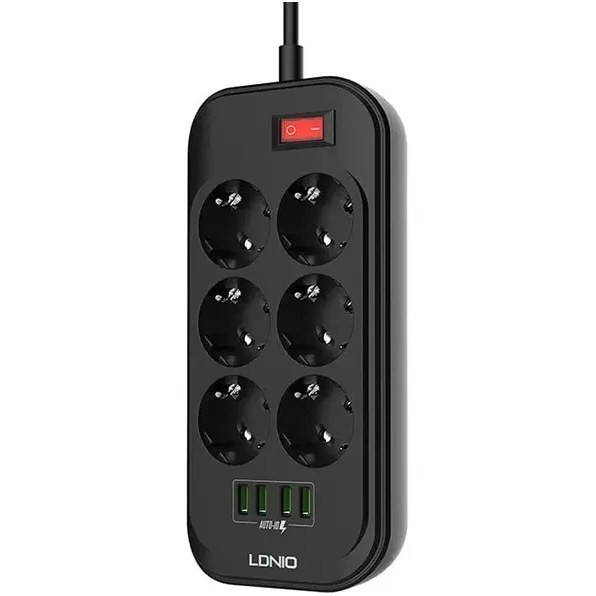 چندراهی برق الدینیو مدل SE6403 ظرفیت ۲۵۰۰ وات با ۶ سوکت و ۴ پورت USB