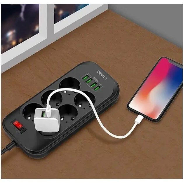 چندراهی برق الدینیو مدل SE6403 ظرفیت ۲۵۰۰ وات با ۶ سوکت و ۴ پورت USB